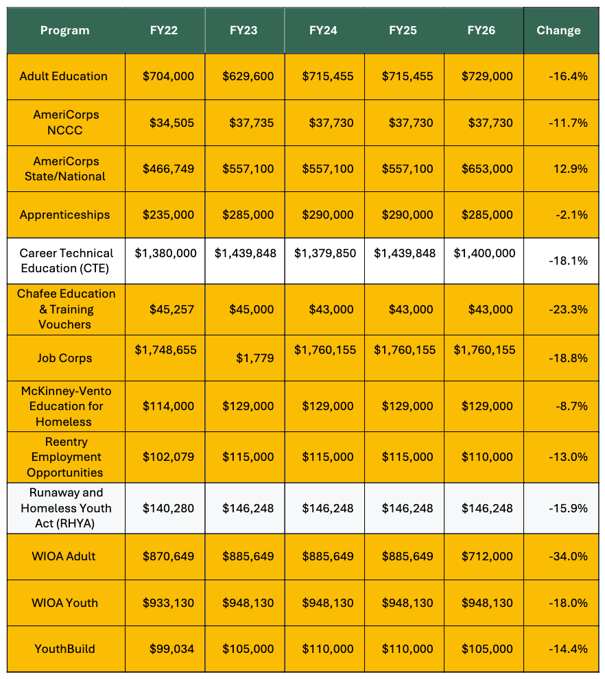 For example, WIOA Youth Services formula funding will be funded at the same dollar amount for the fourth year in a row. To keep pace with inflation just over the past four years, this line item would need to be $144 million higher in FY26 than the $948 million included in the LHHS bill. The only exception is AmeriCorps State and National, which has seen a modest increase – a testament to the ingenuity and commitment of national-service advocates.