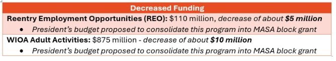 In terms of funding levels, at the Department of Labor the Senate maintains level funding for the WIOA Youth and Dislocated Worker formula programs; YouthBuild; apprenticeship; and, in a major rebuke to the Trump Administration, Job Corps. The Reentry Employment Opportunities program would be cut by $5 million.