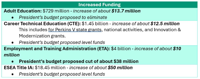 At the Department of Education, adult education grants – which the President’s Budget Request (PBR) proposed to eliminate – would see increases over the fiscal year 2025 (FY25) level. Perkins Career and Technical Education State Grants would also see an increase.